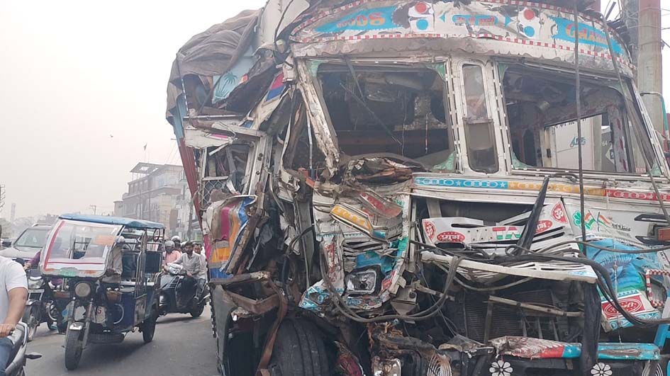 अंबेडकर चौक पर दो ट्रकों की भीषण टक्कर, ट्रक दुकान में घुसा